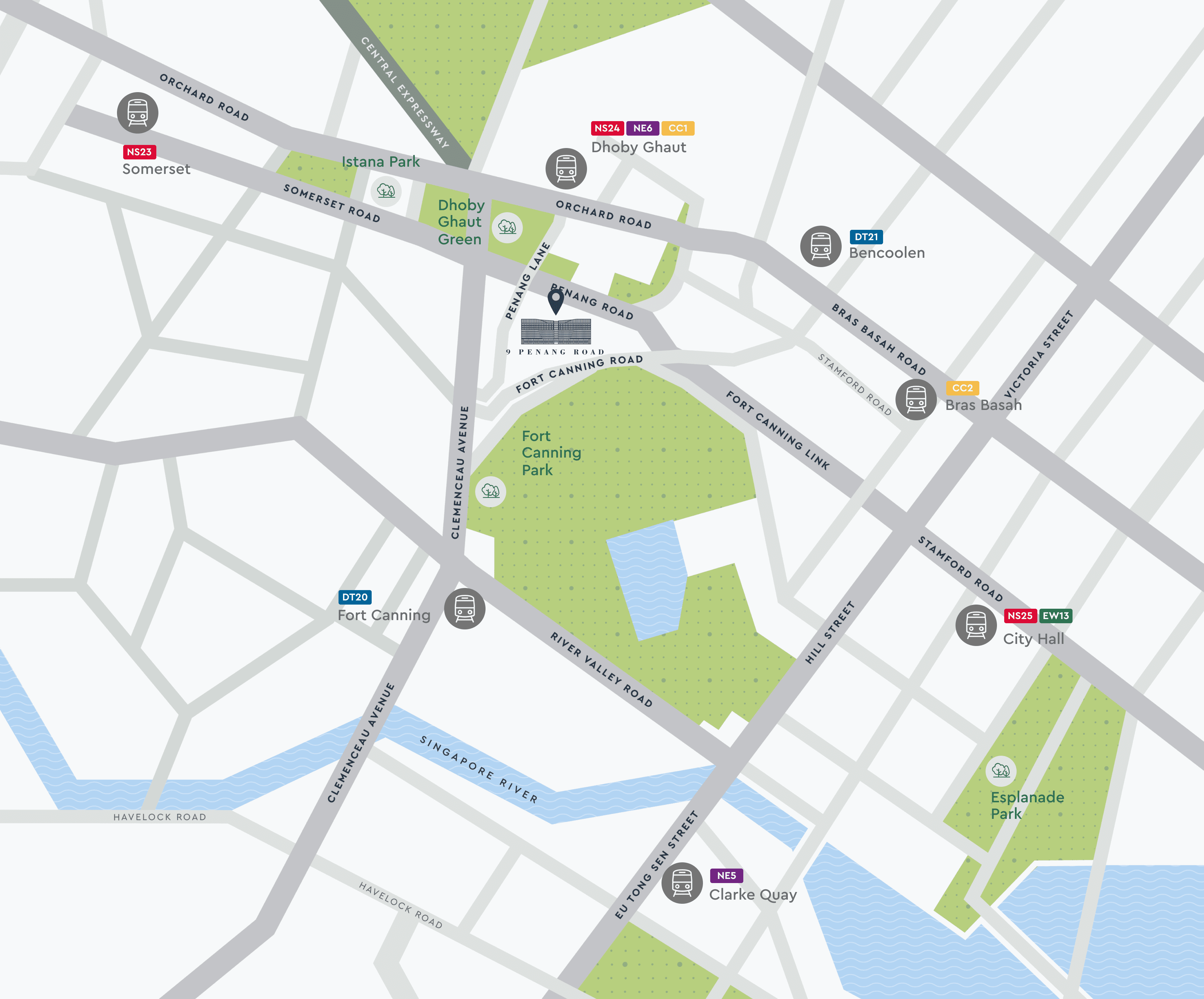 Situated directly next to Fort Canning Park and within walking distance from Dhoby Ghaut MRT Interchange Station, 9 PENANG ROAD seamlessly integrates the efficiency of workplace, the calm of nature and the convenience